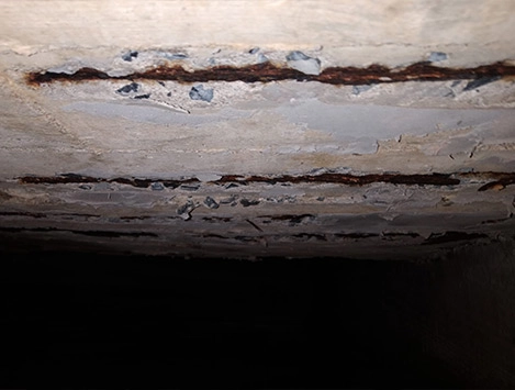 Corrosão exposta na ferragem do concreto. A caixa é avaliada por um engenheiro civil, e caso sejam identificados problemas hidráulicos ou estruturais, a informação é incluída no relatório encaminhado ao condomínio.